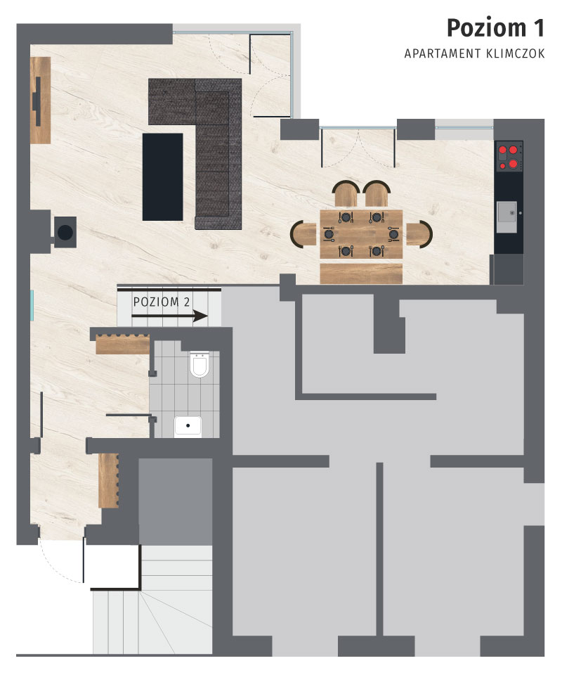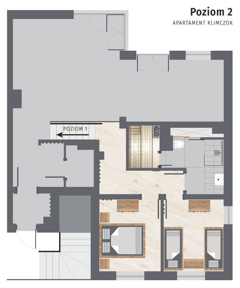 2 poziomowy apartament o pow. 85m² dla maksymalnie 6 osób z prywatną sauną i kominkiem.