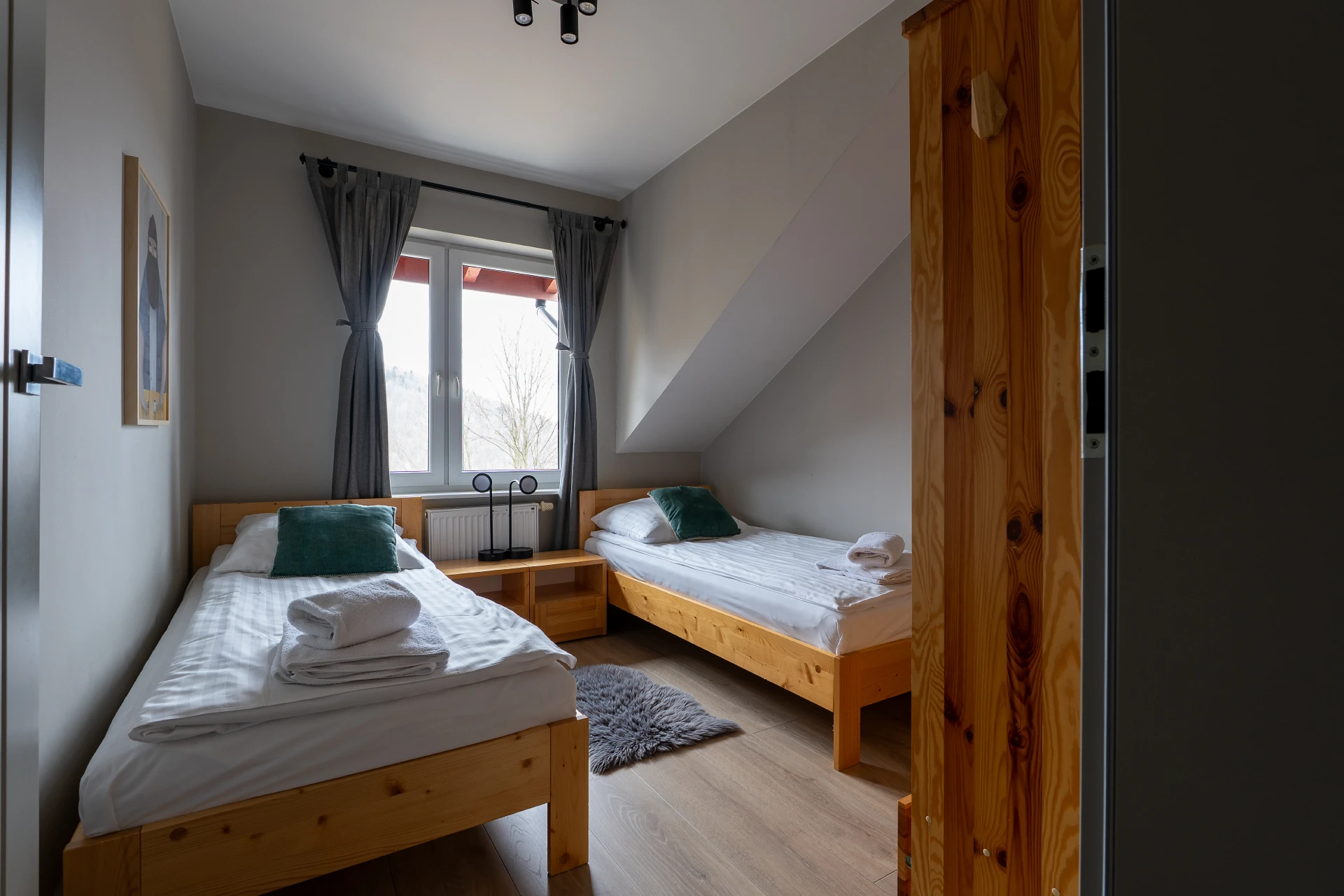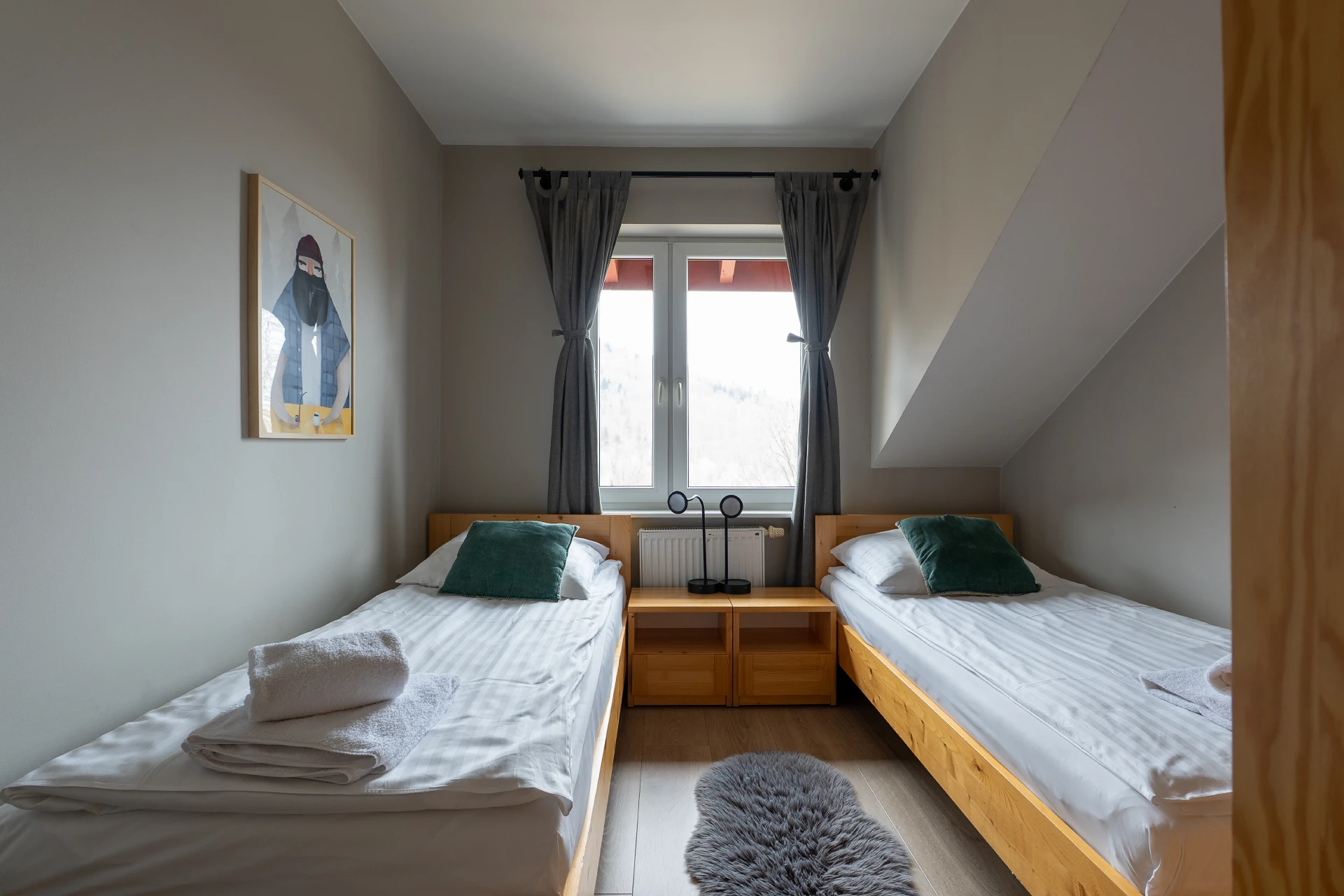 Nasz apartament oferuje komfortowe miejsca noclegowe dla maksymalnie 6 osób. Górna kondygnacja kryje dwie eleganckie sypialnie – główna z komfortowym łóżkiem małżeńskim (160 cm x 200 cm), a druga wyposażona w dwa pojedyncze łóżka (90 cm x 200 cm). Na parterze w przestronnym salonie znajdą Państwo wygodną, rozkładaną sofę, która zapewnia dodatkowe miejsce noclegowe dla 2 osób. Wszystkie miejsca do spania wyposażyliśmy w wysokiej jakości materace oraz świeżą pościel, gwarantujące regenerujący sen po dniu pełnym górskich przygód i aktywności na świeżym powietrzu.