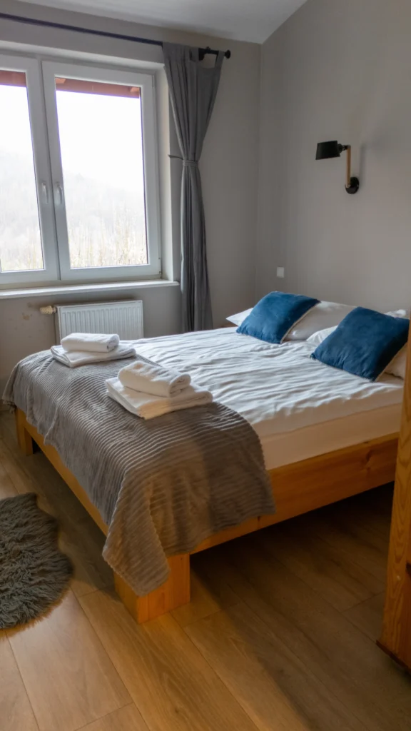 Apartament ten oferuje komfortowe miejsca noclegowe dla maksymalnie 6 osób. Na piętrze znajdują się dwie przytulne sypialnie – jedna z wygodnym łóżkiem małżeńskim (160 cm x 200 cm), druga z dwoma pojedynczymi łóżkami (90 cm x 200 cm). Dodatkowo na parterze pomieścimy dwie osoby, dzięki rozkładanej sofie w salonie.Wszystkie łóżka wyposażone są w wysokiej jakości materace i pościel, gwarantujące doskonały wypoczynek po dniu pełnym górskich atrakcji.