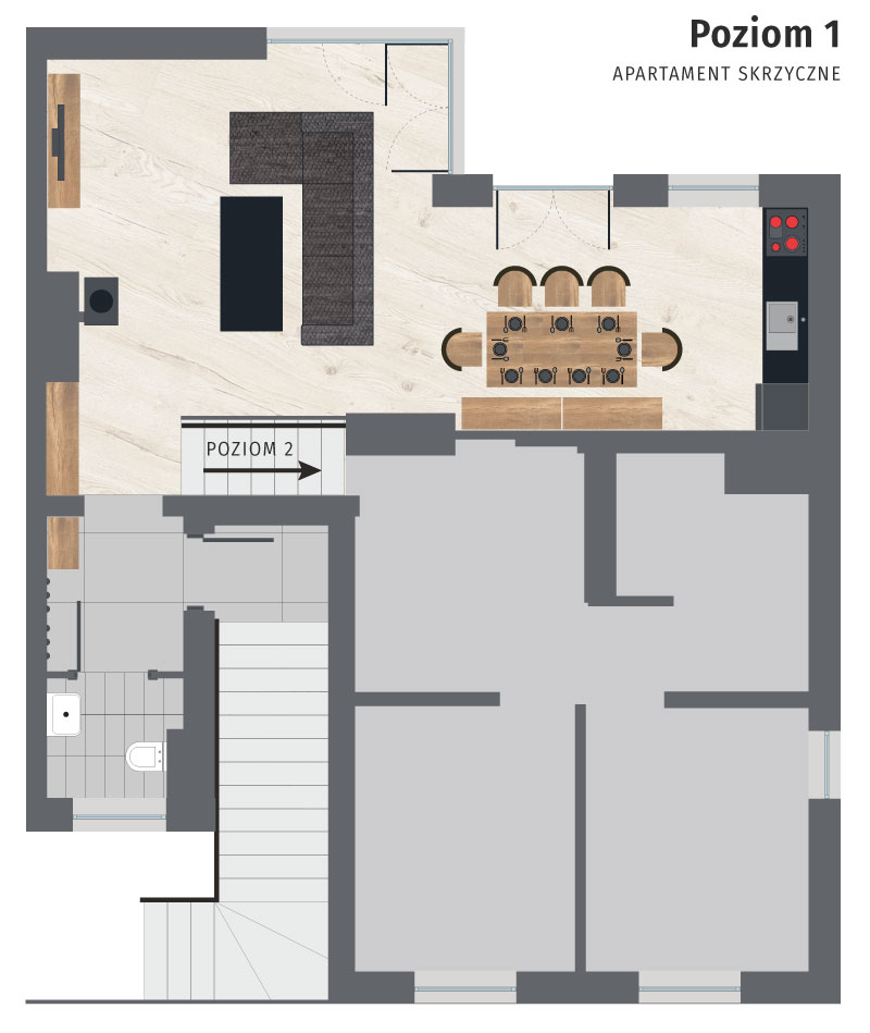 3 poziomowy apartament o pow. 125m² dla maksymalnie 9 osób z prywatną sauną i kominkiem.
