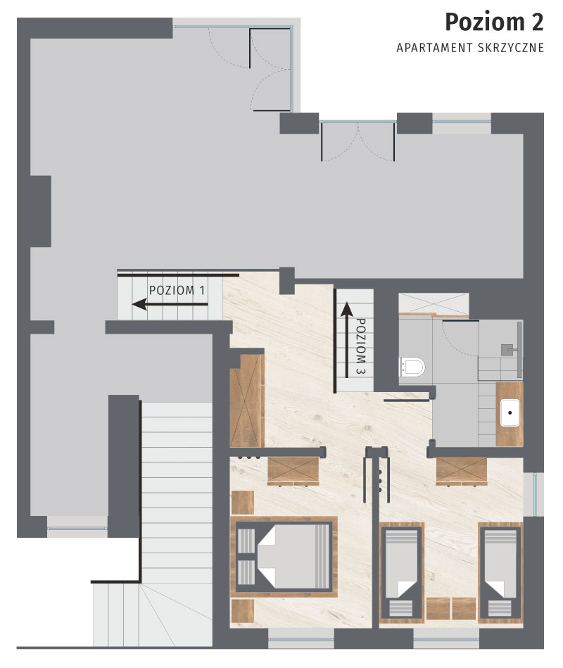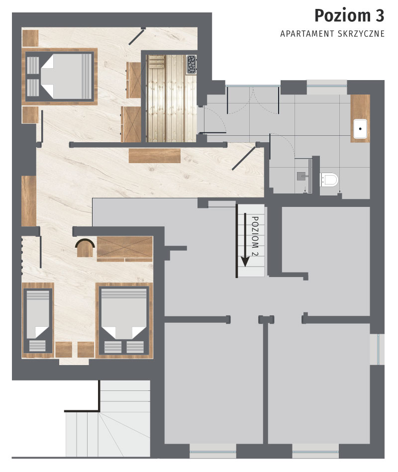 Apartament ten oferuje komfortowe miejsca noclegowe dla maksymalnie 9 osób. Na parterze w salonie mamy rozkładaną sofę, która zapewnia wygodny nocleg dla 2 osób. Na 1 piętrze znajdują się dwie przytulne sypialnie – jedna z wygodnym łóżkiem dwuosobowym, druga z dwoma pojedynczymi łóżkami (90 cm x 200 cm). Na 2 piętrze znajdują się dwie sypialnie – jedna z wygodnym łóżkiem małżeńskim (160 cm x 200 cm), druga z pojedynczymi łóżkiem (90 cm x 200 cm) i dwuosobowym.  Wszystkie łóżka wyposażone są w wysokiej jakości materace i pościel, gwarantujące doskonały wypoczynek po dniu pełnym górskich atrakcji.