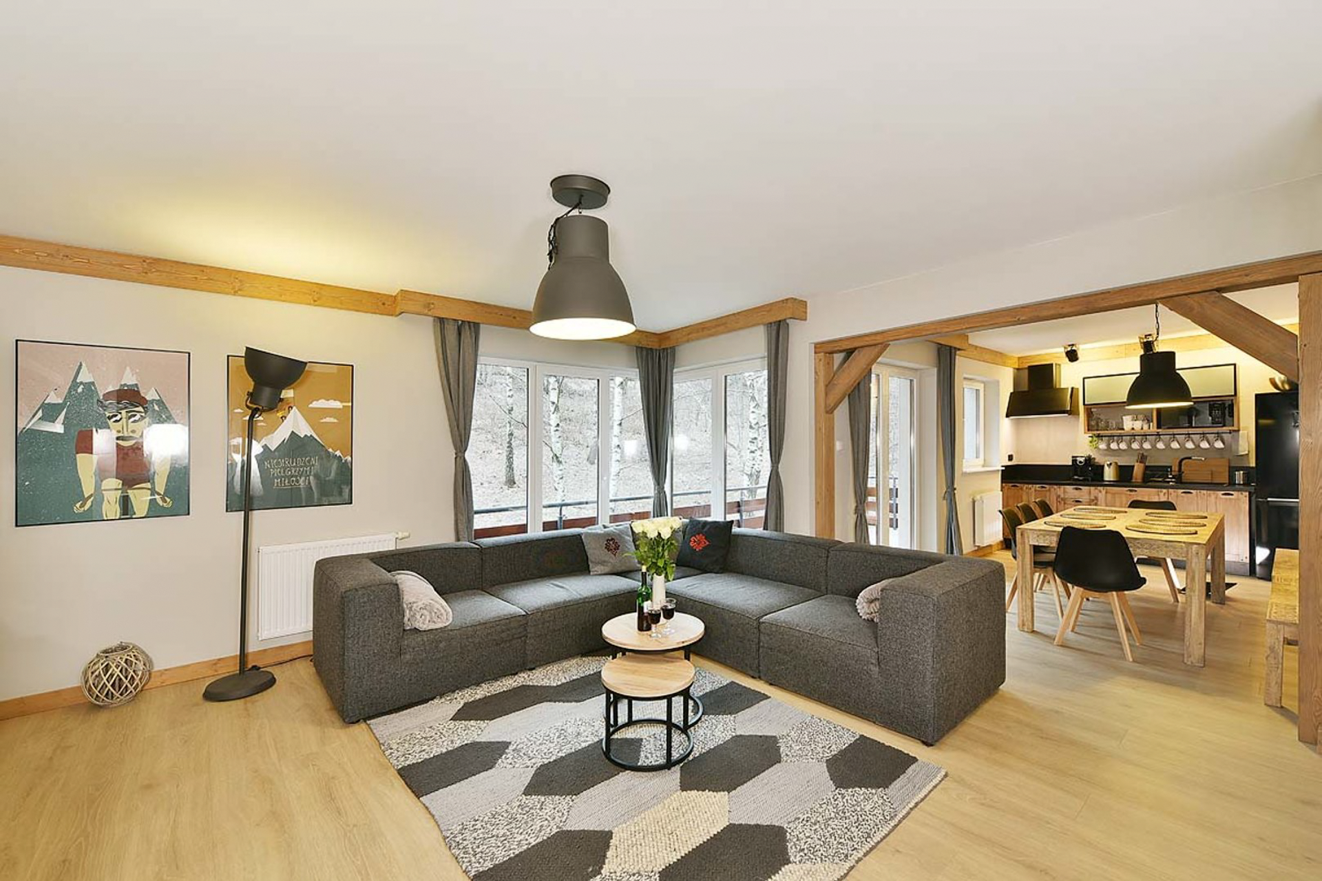 Apartament ten oferuje komfortowe miejsca noclegowe dla maksymalnie 9 osób. Na parterze w salonie mamy rozkładaną sofę, która zapewnia wygodny nocleg dla 2 osób. Na 1 piętrze znajdują się dwie przytulne sypialnie – jedna z wygodnym łóżkiem dwuosobowym, druga z dwoma pojedynczymi łóżkami (90 cm x 200 cm). Na 2 piętrze znajdują się dwie sypialnie – jedna z wygodnym łóżkiem małżeńskim (160 cm x 200 cm), druga z pojedynczymi łóżkiem (90 cm x 200 cm) i dwuosobowym.  Wszystkie łóżka wyposażone są w wysokiej jakości materace i pościel, gwarantujące doskonały wypoczynek po dniu pełnym górskich atrakcji.