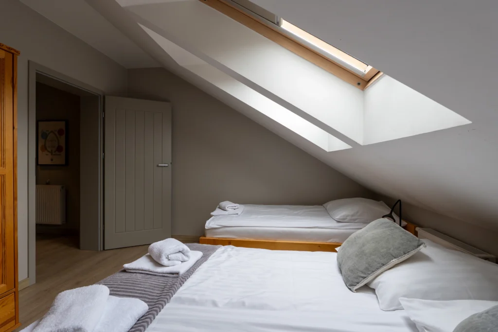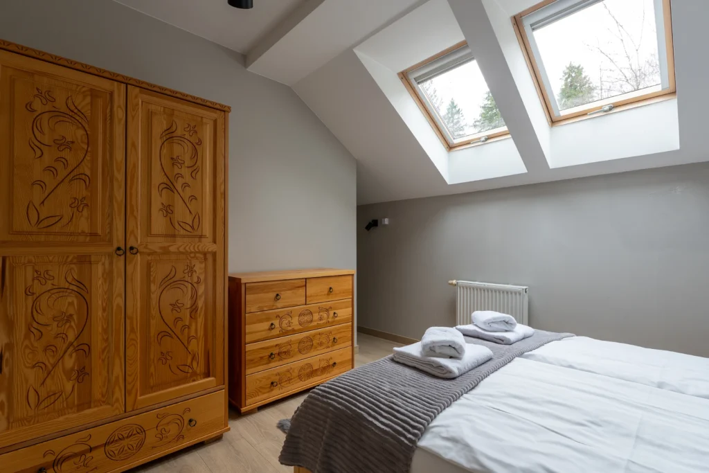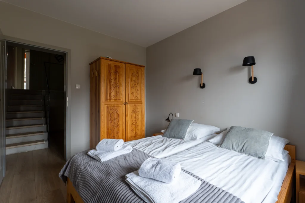 Apartament ten oferuje komfortowe miejsca noclegowe dla maksymalnie 9 osób. Na 1 piętrze znajdują się dwie przytulne sypialnie – jedna z wygodnym łóżkiem dwuosobowym, druga z dwoma pojedynczymi łóżkami (90 cm x 200 cm). Na 2 piętrze znajdują się dwie sypialnie – jedna z pojedynczym łóżkiem (90 x 200 cm) oraz dwuosobowym, druga z łóżkiem podwójnym (160 cm x 200 cm). Dodatkowo na parterze w salonie mamy rozkładaną sofę, która zapewnia wygodny nocleg dla kolejnych 2 osób. Wszystkie łóżka wyposażone są w wysokiej jakości materace i pościel, gwarantujące doskonały wypoczynek po dniu pełnym górskich atrakcji.