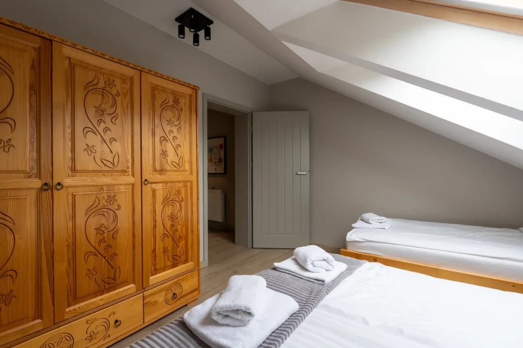 Apartament ten oferuje komfortowe miejsca noclegowe dla maksymalnie 9 osób. Na 1 piętrze znajdują się dwie przytulne sypialnie – jedna z wygodnym dwuosobowym łóżkiem, druga z dwoma pojedynczymi łóżkami (90 cm x 200 cm). Na drugim piętrze także znajdują się dwie sypialnie – jedna z wygodnym łóżkiem małżeńskim (160 cm x 200 cm), druga z dwoma łóżkami – pojedynczym łóżkiem (90 cm x 200 cm) oraz łóżkiem dwuosobowym. Dodatkowo na parterze w salonie mamy rozkładaną sofę, która zapewnia wygodny nocleg dla kolejnych 2 osób. Wszystkie łóżka wyposażone są w wysokiej jakości materace i pościel, gwarantujące doskonały wypoczynek po dniu pełnym górskich atrakcji.